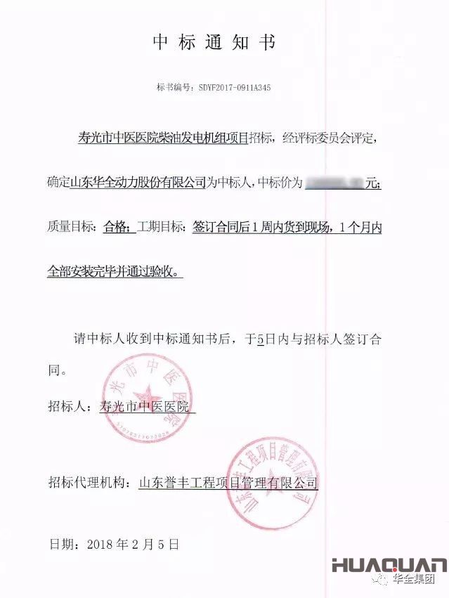 新春好氣象,喜迎開(kāi)門(mén)紅!2018年2月5日,濰坊華全電力有限公司成功中標(biāo)壽光市中醫(yī)醫(yī)院柴油發(fā)電機(jī)組招標(biāo)項(xiàng)目-成交大型機(jī)組訂單